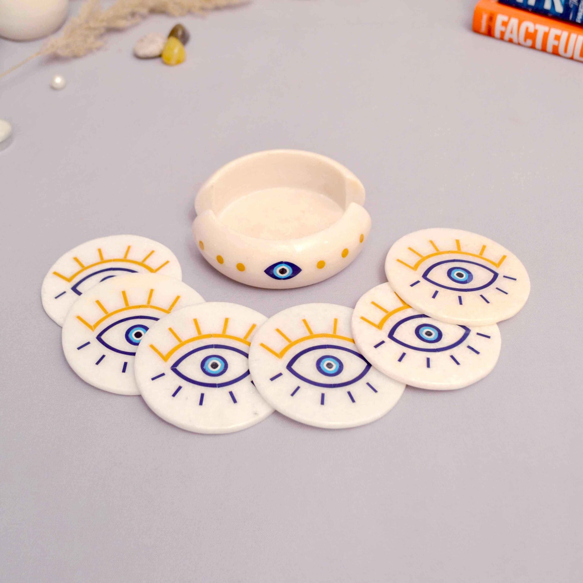 Evil Eye Coasters (Set Of 6 ) With Stand (Pietra Dura using semi-precious stones)