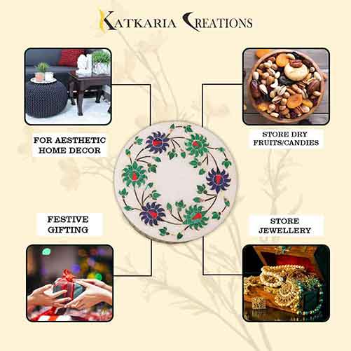 Great For storing jewellery, gifting and décor Total Dimensions in (Inches) -4? L X 4? W X 1.75? H, Weight: 600 gms Store your knick knacks in this beautiful marble box. Material – White Marble and semi precious stones. Perfect for your dressing rooms/tables to store fine jewellery pieces.